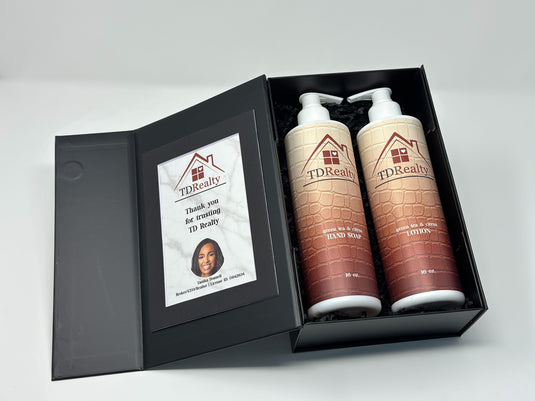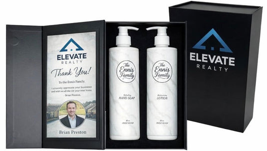 Our ready-to-gift boxes are simple to personalize and quick to order. Each one includes a beautiful hand soap and lotion set in a sleek box that can be customized with your logo, message, or photo inside.